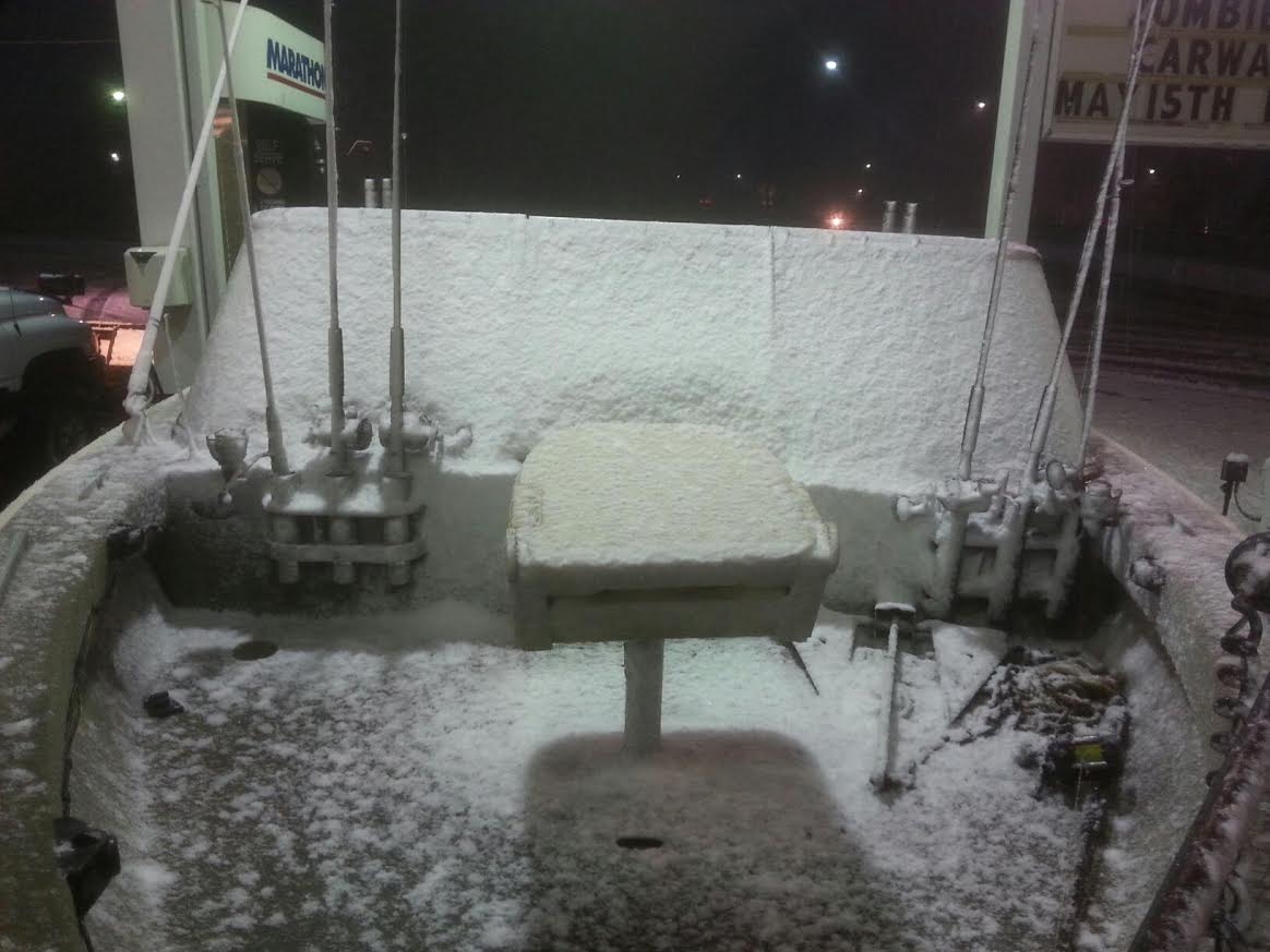 Well ..... If anyone one was up here you know how bad it was and for those who stayed back ..... Smart move. I had to get the boat tied to the dock so we Braved the weather. Pulled him through three inches if snow over route 2 bridge Friday night and had to clear six inches with ice of his bow Sunday before we put in the water. Good news everything went perfect. All except I found I have a bad sending unit but that can be replaced. I think that has been the most stressed I've been at the lake. Hope it's smooth times ahead. Congrats to the winner of the LEWT. That was some rough fishing Sunday. Attachment 3826