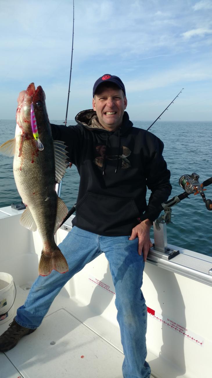 Launched out of Huron about 8 am. Parking lot was already full. North to dumping ground and trolled DJ's Bandits North with 2 oz. 60 to 85 back at 1 mph +-. Picked up this nice one and a few more. Lots of jigging around us and the radio chatter sounded like jigging was working but also heard a lot of smalls jigging too.
