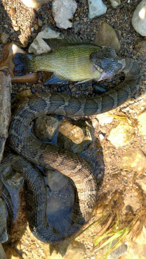 Had a small snake, about 2 ft crawl up out of the water in front of the boat this evening with this little blue gill as his prise.