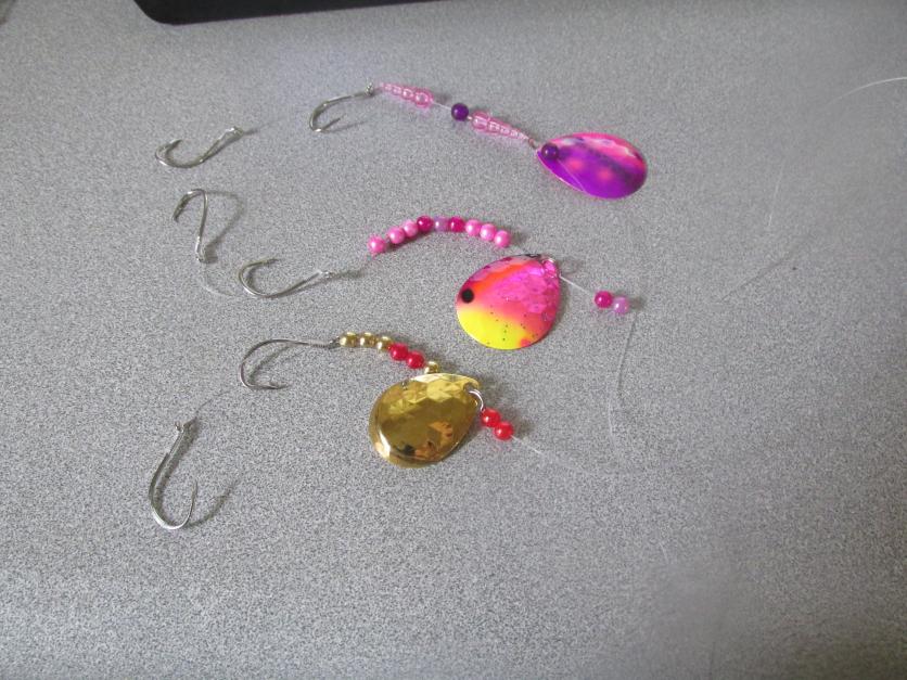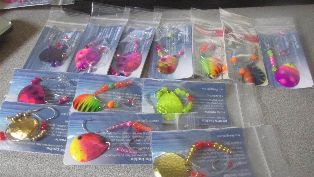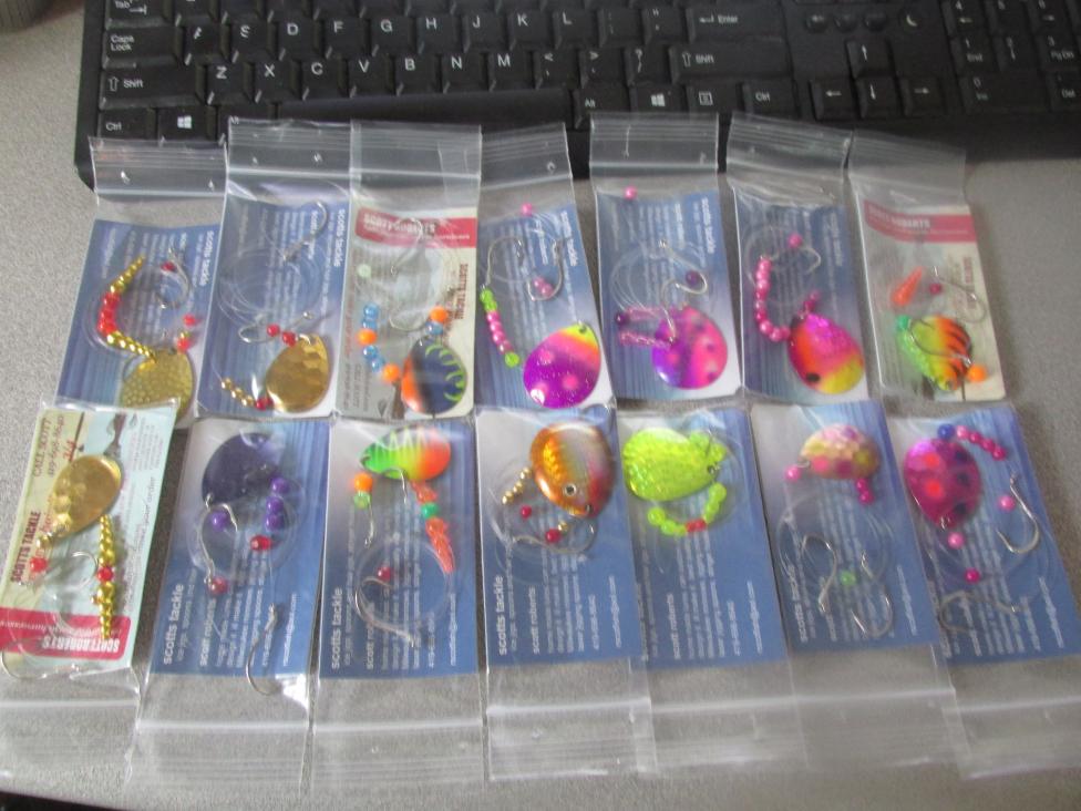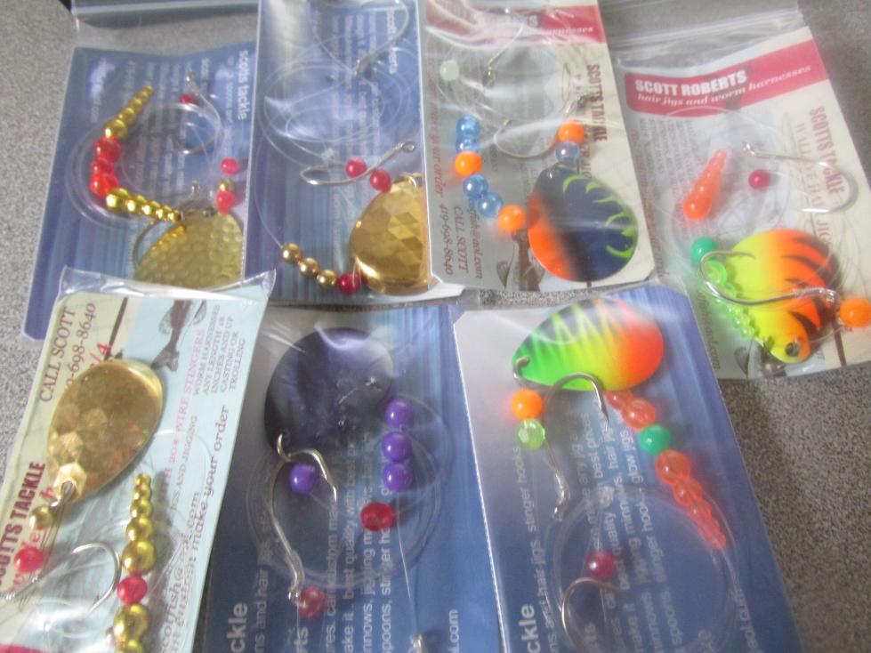 ill make anything you want have about 30 different color blades any length one hook or 2, floaters or not most common mayfly rig is gold or copper double hook 18 inches long with a 3/4 ounce egg sinker but i will make any color blade bead or length call scott at 419 698 8640Attachment 4707Attachment 4708Attachment 4709Attachment 4710