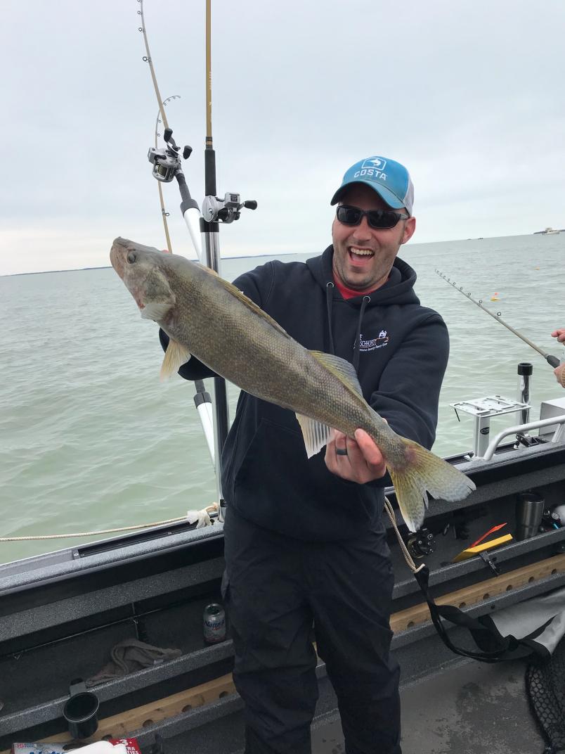 I had trips scheduled with these guys for Saturday afternoon and Sunday morning, but they had a charter set up for Friday that canceled so they called me to see if i could take them out Friday and we made it work. I picked them up at the dock at 2 pm and we headed out to the east side of south bass where we found a pocket of fish in the morning and they where still there. We caught an 8 man limit in 4 hours. Went out again on Saturday at about 1:30 and found our clean water was muddied up so we searched up some clean water north of Kelly's and put a 7 man limit in the boat in 3 hours. Both days we put fish Ohio's in the boat long enough for photos and they all went back to be caught another day. (I love watching them big ones go back in the lake what a cool thing to see from a sportsman) but they had a great basket of really nice walleye for them to take home. We caught them Friday on top 20's and bandits pink, lemonade, lime green all bright colors. and Saturday the same but they wanted orange and khaki and gold both days we fished from 15 down to 25 feet deep and we caught them at all depths. the fish are hungry and active spread em out and run em from 1.3 to 1.7 and watch the boards.