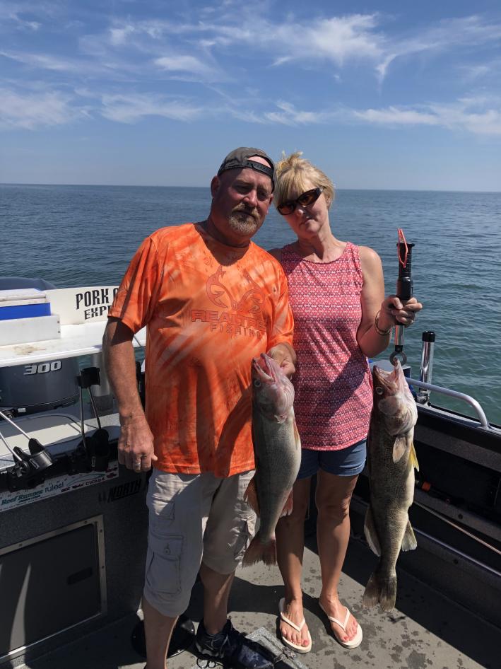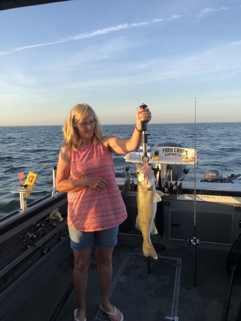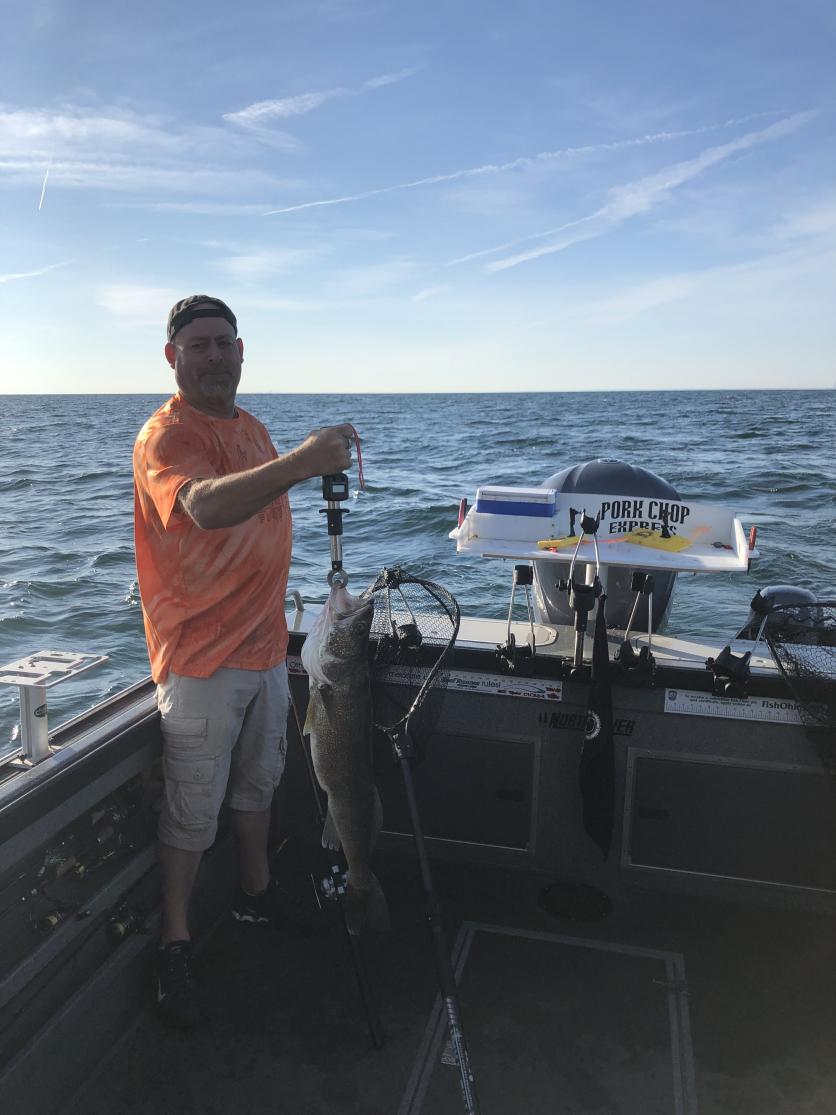 Wow Wow and Wow did we have a great trip Monday morning with a really nice couple from West Virginia. When the husband called he said they had a bad trip in the outer-banks not catching any fish. He said he just wanted his wife to be able to catch some fish. Boy did she ever, 31”, 26”, 28” some great fish. They had a blast and so did I. They said they will be back again in the fall to fish some more. We fished the weather buoy in 60 foot of water and found some great fish. We ran bandits 50/100 and 50/125 with 2oz and jet 40's 85 to 90 back with phantom Dagger #7's at 2.5 to 3mph. We caught fish before the second line was out, it was that kind of day. When they got tired of trolling we moved in over the south end of the dump and drifted and cast weapons rigs and the caught some walleye with the rod in hand and also a big channel catfish. super trip, super people and super fishing doesn't get much better.
