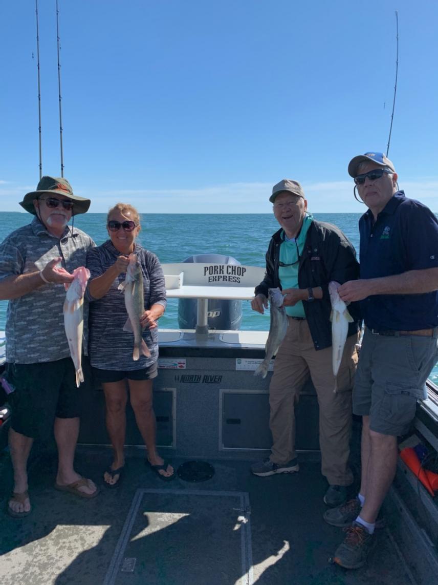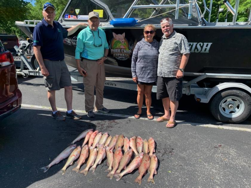 After fishing in the LEWT tournament in Lorain on friday and saturday which we finished 20th with some hot flat lake conditions, I was able to get back to work with a great trip with this nice crew from Indiana. We left mazurik launch at 6AM and headed north to the Canada line favoring east near gull shoal. We pointed south and started to set bandits at 2.0 to 2.3. I was letting out the first line and when the counter hit 50 it was hit and fish on. The rest of the morning was just like that. Fish after fish on bandits back 50 to 65 all picked up fish. My hottest color all weekend was taco salad, it out performed every color but they all caught fish. We picked up this group their limit of walleye and upgraded some smaller fish with better sized 20 to 22" fish. We made one pass south and ended up right between south bass and kelley's at the monument. We had to wrap up at 10 am as one of our crew got sick from the waves. Great morning on the lake and the wind started to lay down as we came in. We filleted up their walleye and sent them home with some great dinners to come.Attachment 6252Attachment 6253