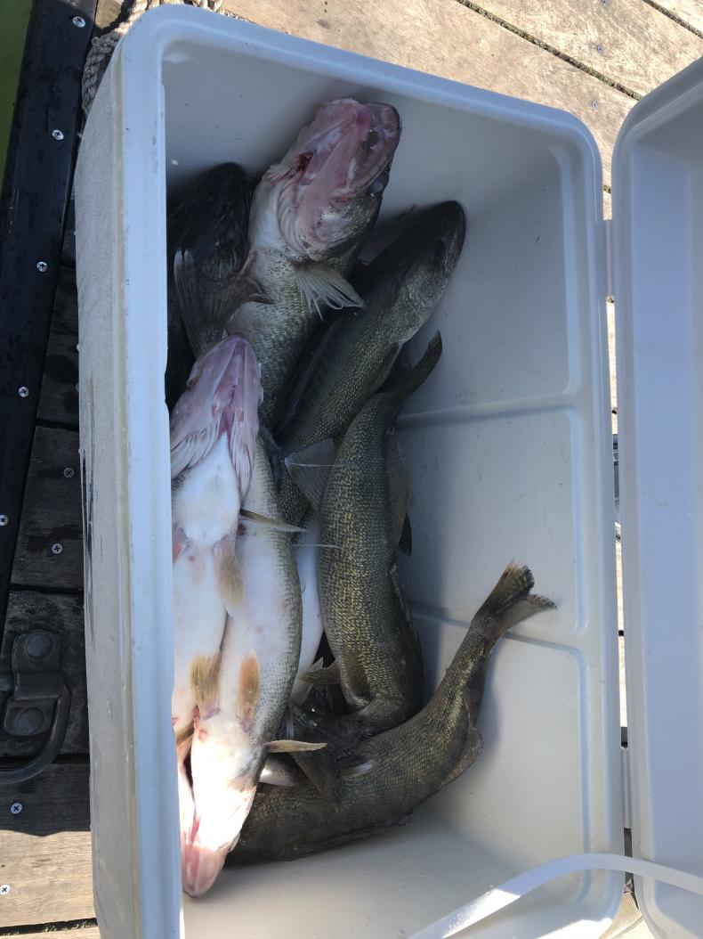 We launched at mazurik at 6 am and headed north again to just outside north bay on the north side of kelley's island. We set a south west to west troll as the wind changed to out of the east. We had a two man limit and was upgrading fish before we got half way to the monument. We ran the bandits 50 to 75 back unassisted and two 4 oz bottom bouncers of the corners at 2.3 to 2.5 a little faster today. We caught a lot of junk fish on the bouncers until the sun got up then we started picking up walleye. We picked up our better fish closer to the monument. We turned and trolled south straight at mazurik launch and caught fish until we picked up lines half way across the south passage. There where a lot of fish in the south passage. We sent these fellow home with a nice cooler of walleye for some good dinners. Good trip with a couple of real cool fellows with a lot of great stories.Attachment 6256