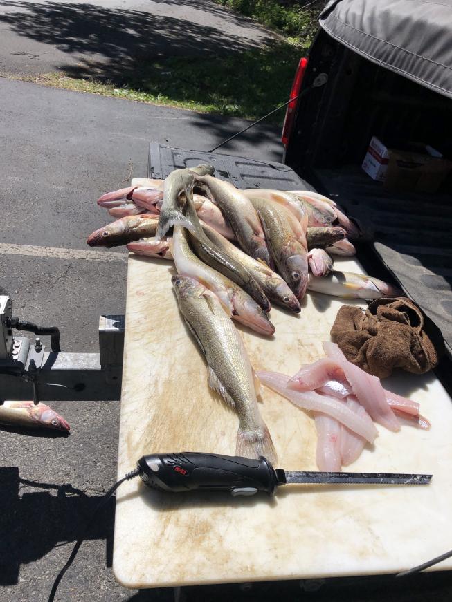 With the winds out of the north east today I knew it was going to be rough and it was. My crew was ready to go and we had to get in the boat on shore to keep dry feet and then launch the boat with the high water from the wind. We launched at 6 am and headed to just north of kelleys along north bay and trolled south west with the wind towards mouse island. The bite was a little slower than yesterday and the water was starting to get more stained as the day went on but we manages 24 walleye for this crew of four. It was a find your sea legs kind of day for sure but the walleye make it worth the effort. We ran bandits and a couple bottom bouncers with harnesses at 2.0 to 2.5 from 35 back to 75 back and they all caught fish. We sent them home with a nice haul of fillets for some good meals. Nice trip with a set of old friends and some good fish stories.