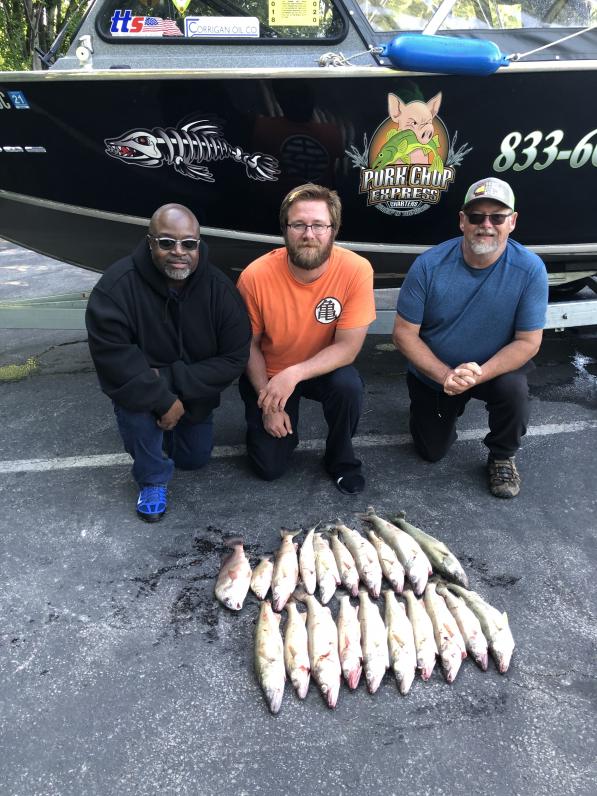 We launched from mazurik at noon and headed back to north of kelley's and trolled with the wind again same direction but a little more north and south staying to the east side closer to kelley's as the water was getting more and more stained. had to throw out a drift sock this trip as the wind was picking up a bit more. We followed the mud line and the bite did too. We ran bandits 40 to 85 back and two bottom bouncers with harnesses off the sides. 1.8 to 2.0 mph had to slow down a little this afternoon and the fish where a little smaller grade. A couple passes and we had this crew their 18 walleye. They like to clean their own fish so bonus for me. We will be fishing with this crew again in august in the deep water out be the weather buoy. Tomorrow is a blow day so that is it until next saturday and I will be fishing for 9 days straight weather permitting.