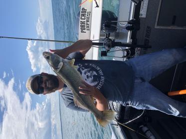 We launched at Mazurik at 1:30 and headed to a new area I wanted to fish just to the south east of Kelley’s island. This trip is a graduation trip for the two young men aboard as one of them leaves for the army on July 7th and I really wanted to make this a great trip for them. I marked some good fish and set up on an east troll as the wind had almost died completely. We set up bandits from 80 to 50 back as the marks where high. We set speed at 2.0. We caught 18 fish in 30 minutes it was almost ridiculous. We turned and made another pass and narrowed down the fish. They wanted purple with pink belly and back 70 to 80 and speed of 2.5 to 3 mph was the magic set up. We ended with a 5 man limit including me reeling in my limit today. We threw back 4 that we reeled in picking up lines. We where finished up by 5:30 and just floated around on the lake and talked and enjoyed the evening for an hour before heading in to fillet the fish. It was an absolutely beautiful evening on the lake. I have this crew again tomorrow morning. Looking forward to it.