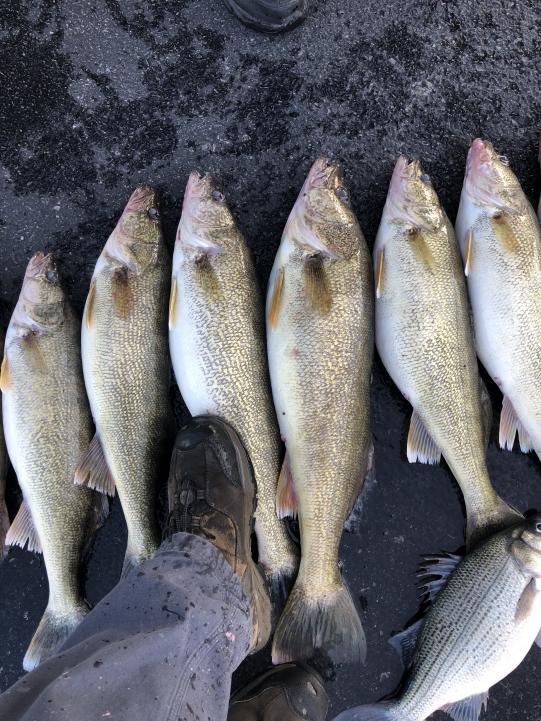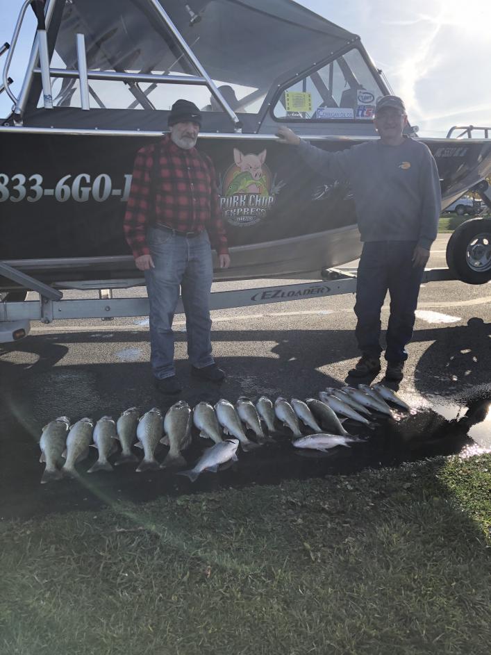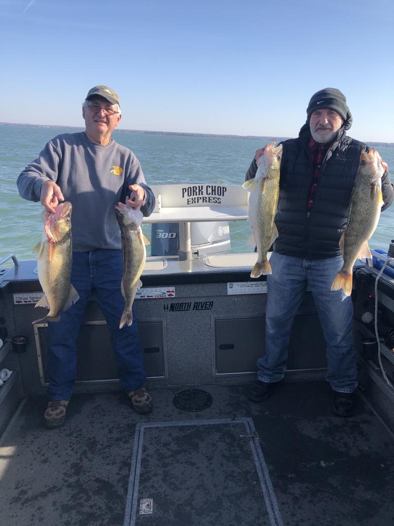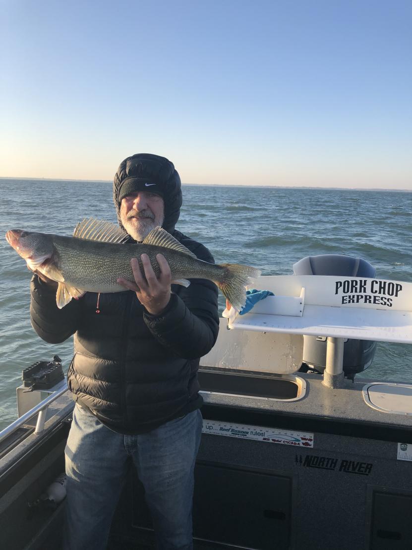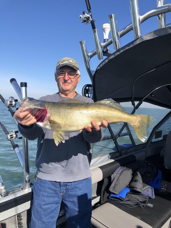 We launched out of Huron at 7 am and headed west of the dump and set up trolling northeast with the wind. We picked up 6 fish on that pass but the bite was slow and not the marks I was looking for so we headed east towards Vermilion. We found a nice pod of fish and set up on a very good bite. and had a three man limit in very short order and played catch and release for a while before heading back in. We ran all white bodied bandits today and of course i always have at least one blue chrome out. speed was 2.0 today and we caught them high and low. 50' leads with 2 oz back from 60 to 120 total line out and they all caught fish. Biggest fish today was a 9 lb fish good grade of fish today. These guys are coming back in the spring to try for a wall hanger walleye for Romans trophy room. Very nice weather today hard to believe its november.