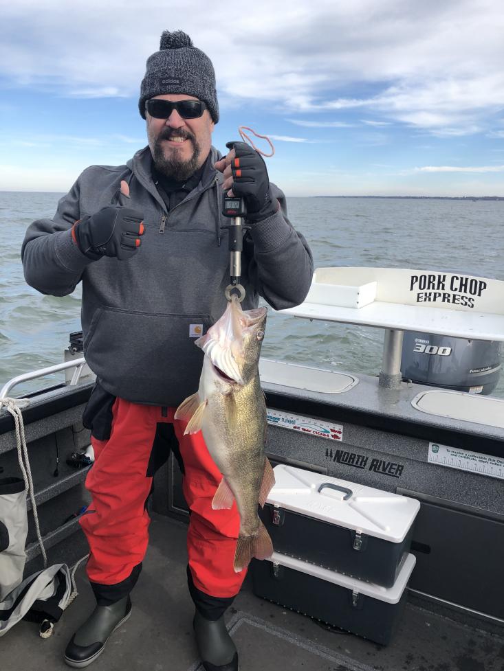 Today was a training trip to teach some new trollers how to use boards. We probably didn't pick the best day as it started out with a pretty stiff wind, but it laid down after a few hours somewhat. We started out by cedar point and that area was packed and i mean packed with bait. We did pull 4 nice fish from that area and then we went searching. We found bait just packed in 30' and closer to shore all the way from the castle to cedar point. Most of the fish marks we found where on the bottom. I'm assuming since the prior night was clear and a big bright moon that the fish ate all night and where sitting on the bottom full of shad. We set up chrome blue bandits and ran them 100 back with a 2 oz putting them right on the bottom with all of those big marks and we where able to pull a few nice big 9 and 10 lb fish. i slowed way down to 1.5 and it seemed to get us some bites and put some fish in the boat. I think we got them trained up on setting boards as we reeled in and moved so many times they got lots of practice. The amount of bait near shore in that area is amazing and the bellies of the fish we filleted had 10 to 12 shad in them. This is great for the fish and getting them big and healthy for the spring spawn but makes them a bit tougher to catch. We will see what the weather brings us, maybe we can get a few bonus winter trips in.