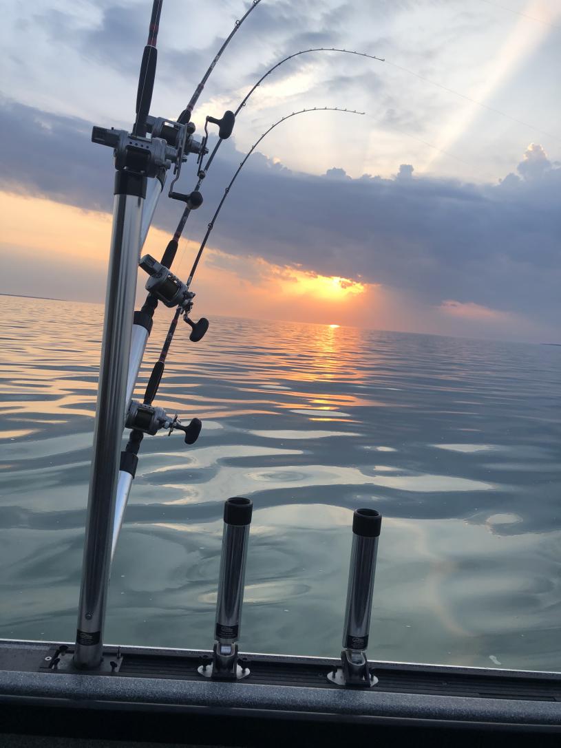 We lunched at Mazurik and headed north and got set up on some good marks. We found a very active school of fish with bandits and flicker minnows back 35 to 65 at 1.3 to 1.5. The gold flickers smoked the fish today. We had their limits and mine by 10 am. with some very good quality fish. We had to keep circling a tight spot to get it done. I love this picture of the sun rays shining down on one of my Off Shore Tackle Boards.Attachment 6873Attachment 6874Attachment 6875Attachment 6876