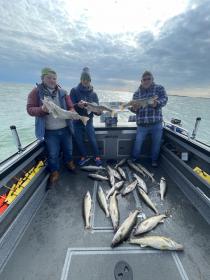 First trip was a smack down on the walleye we boated 22 walleye in 3 hours great bite. Had to fight some waves from the east wind but not terrible. Had a nice time with this crew from Indiana. We ran bandits 55-85 back dark colors 1.9-2.2 mph.
