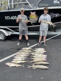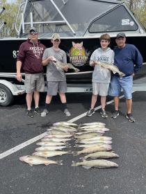 Really good trip this morning with a couple first timer kids on the boat, we had a ball reeling in their limits of nice walleye. We ran bandits back 80-50 at 1.9 -2.2 mph darker based colors worked for me today. The fish where in pockets when you found them you had to work them.