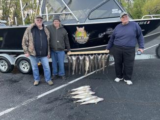 Good afternoon trip today first trip back from Texas with my new camper. We boated this Illinois crew their limits of nice walleye, it was bumpy going out but then it laid down nice. back at it first thing tomorrow with same crew then afternoon with a MI crew. We ran to Lucy’s point and found a nice pod of fish we ran bandits back 65-120 at 2.0 chrome and purple did the work.