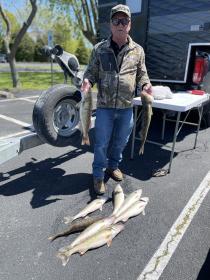 Morning trip was a tough one. Bumpy lake and fish I’ve been working where gone. Took 3 hours of searching and we found them and got this cool cat from WI his fish and half of mine. Turned out a good trip. These fish are moving around like crazy. We got them on bandits back 50-85 color was green and chrome blue. 1.6 mph.