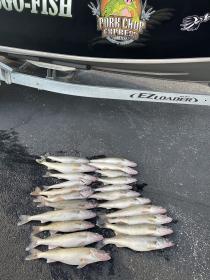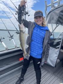 Our afternoon trip today went well we boated 22 nice walleye before everyone had enough of the wind and it was getting bumpy. This young lady caught her first walleye ever. Fun trip. We ran bandits back 40-90 blue chrome and taco salad working well