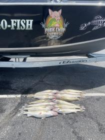Morning bite was slow today but we got the WI crew their limits of walleye and some of mine. It’s getting hot out there and flat as a pancake. Even the boards have a wake!! We ran bandits blue chrome and taco salad at 90-100 back at 2.0 today.
