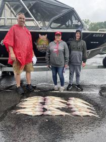 Afternoon trip today had a lot more rain. But it turned the fish bite on. We got this southern Ohio family their limits of nice walleye and my mates other 2 to finish his out. 7 limits thru the Pork Chop Express today in the rain made it out to be not such a bad day. We ran flicker minnows near the Canadian border 65-25 back did the work 2.3 mph.