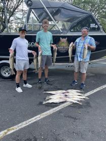 Our morning trip went very good today we set up on some nice marks and had this southern ohio crews limits of walleye In An hour and a half. The winds where picking up pretty good out of the northwest so we decided to head in. Glad we did the waves built to 4-5’ whitecaps took a long time to get back into shore slow and easy. Seth never got a limit before and these two boys have never fished erie before so this was a treat to show them what she has to offer. Not looking good right now for second trip with these waves, we will see what the day brings. Flicker minnows at 2.0 today.