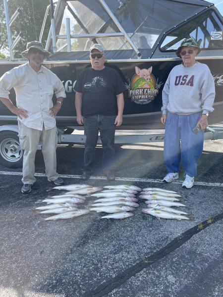 Morning trip today was game on as soon as the lines hit the water. We limited out for these cool guys from IN and WI Walter, John and Steve. Got them a couple bonus fish as well. Had to fish the trough with the south wind made a bumpy troll but we got the job done this morning in hour and a half. Flickers back 100-55 dipsy with worm burners back #1-40 #3-50 2.3-2.7 speed