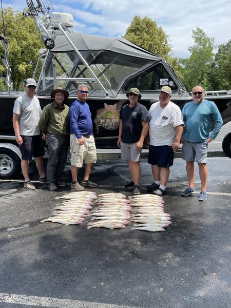 We battled the wind and waves today and had to search a little as the fish we have been on moved some. We found them and put a 6 man limit in the Pork Chop Express. Made this WI crew happy. It was a long ride back in with the waves out of the southwest but overall not that bad out there this morning. We ran flicker minnows back 100-60 at 2.3mph between Kelley’s and buoy on the line Back at it tomorrow morning bright and early..Attachment 7232