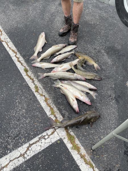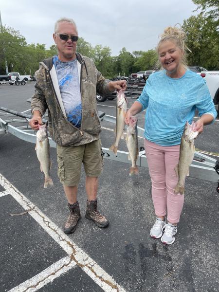 Morning trip today was a fun one with Steve and Vicky from WV. We had a drift and cast trip this morning that worked out good. Took a few spots to find the fish but when we did we filled their limits with 3 extra cat fish. Fun day throwing spinners off carpenters point.