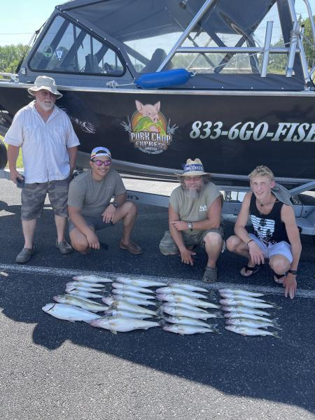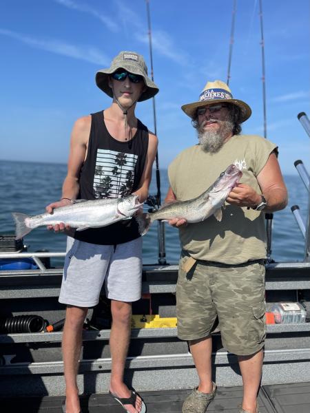 Good morning trip today and a better bite. We had their limits and a few of mine with a bonus steelhead by 10 am today. Some great fishing today we had the first fish on with 2 rods in the water. All on flickers 120-80 back at 2.5 50’ of water north of Huron.
