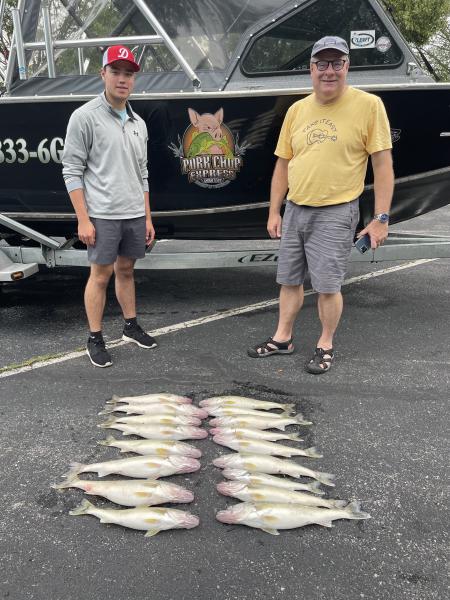 Super great bite out of mazurik boat ramp this morning we boated Bill and Owen their limits of nice walleye and 5 of mine too. Great morning on the lake for these first timers. With a great grade of walleye today. We fished north of Kelley’s shoal with worms and 3oz snap weight 65-30 back at 1.8 mph. Standard Colorado blade harnesses.