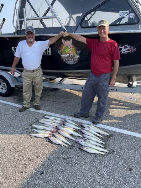 Morning trip today was a fast one we had 21 walleye In the boat by 8:30 they where chomping this morning for sure. These Cincinnati fellas where happy with this catch. We fished Avon today 25’ of water flicker minnows back 100-50 did the work at 2.5mph