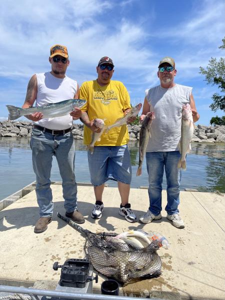Morning trip was slow but steady we boated this ohio crew their walleye with a bonus steelhead and some white bass they decided to keep a good mix of nice fish east of Kelley’s island. Flickers and spro 120 back 120-80 and dipsy with double willow harnesses and worm burners.