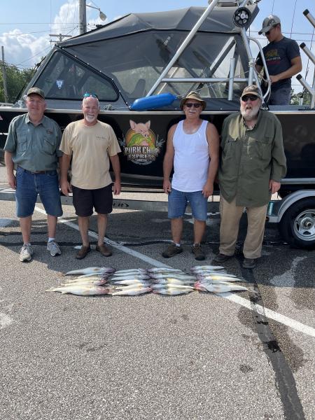 We had a good trip this morning with a crew from Ohio. We boated them their limits of 24 walleye to take home for the freezer. It was a nice morning to fish for walleye the rain clouds have moved out and the sun is starting to shine. We continue to catch lots of 14” fish at least 24 today. Next year is going to be on fire with keeper fish in the system. We fished flickers and dipsy with worm burners in Avon 30’ of water.