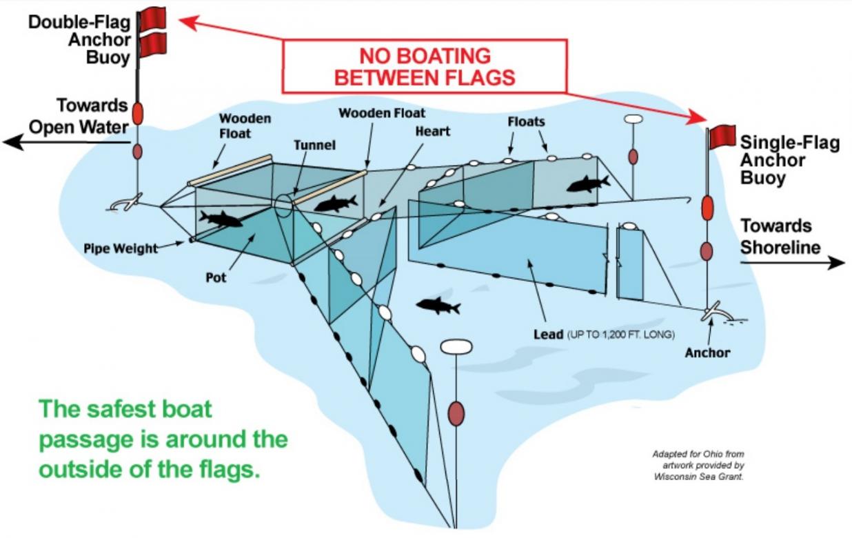 As with a lot of Lake Erie topics, most boaters don't have nearly enough knowledge of commercial fishing nets. Generally most boaters don't encounter them because they boat in the summer and don't go far, such as up along the Canadian border line. In the Ohio waters of Lake Erie there are different zones, seasons, and locations for commercial nets. Below is a link to the actual regulations that determine the locations nets are allowed to be and times of year they can be there. I also included a diagram of a typical trap net, which is the type allowed in Ohio waters of Lake Erie (no gill nets are allowed). If you do a lot of boating and especially early and late season, you should have copy of the ODNR brochure on your boat that has this diagram and the info on commercial nets.