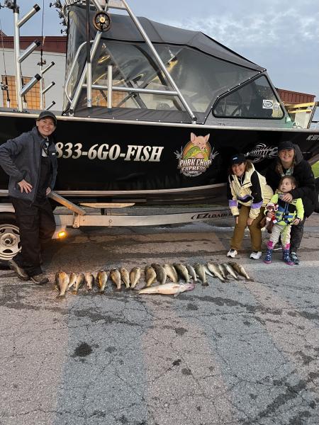 Second trip presented a much improved lake. I was able to run back out to 50’ of water north of vermillion. We ran bandits and flicker #9 at 120 back and 50/150 2 oz in the same perch pattern as this morning and we pulled 22 nice walleye for this crew from Avon. 2’ waves this afternoon was a bit nicer. Some nice fish on this trip. And I got to keep 2 fish for dinner.