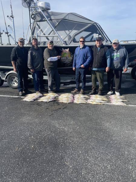 We launched at Huron at 6:45 and went straight out to 38’ of water and set up bandits 50 back no weight 50/120 2 oz and 50/80 3 oz did the work at 2.0 mph the fishing was very good we had 40 fish by 11:30 today. Back at it tomorrow morning before the rain and wind.