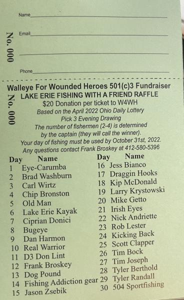 For those that do not know us, we bring over 125 wounded military, paramedics, police, firemen, and any public servants that have been injured in the line of duty to Lake Erie for 4 days of fishing and camaraderie every year. We are looking for help in keeping these trips at no cost to those who attend. We provide food, lodging, captains, and anything needed for these heroes to have a great time. This is our 10th year running so this year we wanted to try this fundraiser that was made possible by many of the fishermen that help us out with the events. I really cannot say how appreciative we are for their donations of a fishing trip and also for taking our event participants out fishing. We have a way to purchase the tickets online thru the Walleyes for Wounded Heroes web page by clicking on the donate button and the bottom selection is for a raffle ticket. I know many on this ticket are both on this site and you recognize their names. Once you purchase a ticket it will be filled in and a photo emailed to you. If you have any questions or problems let me know.Attachment 7584