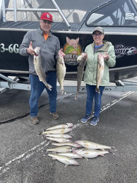 We got wet and beat up on second trip but this couple from Missouri where super troopers and got their limits of walleye. I reeled in two for me too. This was Her first walleye fishing ever and she reeled in a fish Ohio. Good time on mother Erie. She sure let’s you know who is boss now and again. It clouded up and the fish moved some so dark purple bandits at 45-60 back did the work. Speed was 1.8-2.2 in the waves. Lost as many as we landed in the wind and waves.