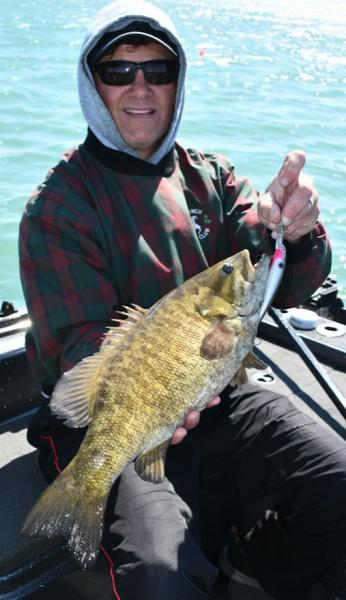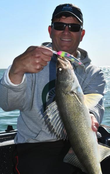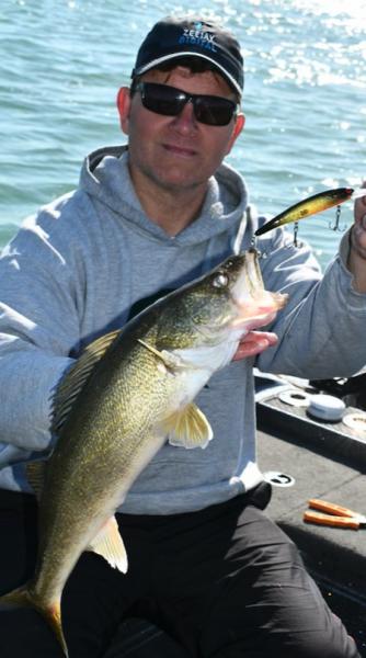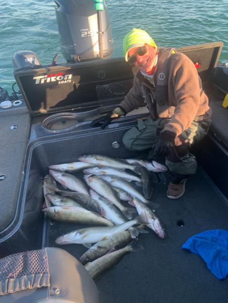 Made it out again near the D-River earlier this week on my buddy Jim's boat. We started out in some greenish stained water that looked perfect for trolling cranks, but after 10-12 white bass, we decided to try moving in closer where there was a pocket of cleaner water. Not crystal clear, as it still had a greenish/chalky tint to it. After about 7 or 8 giant smallies, we thought maybe we needed to make another move, but then the walleyes started showing up. We kept trolling to the E and from then on it was mostly walleyes. Nice fish too. Best speeds were 1.8 - 1.9, leads were 20-25, pushing the boards way out from the boat seemed to matter. We started the day with one side tight to the boat and the other side I pushed out 70/110/150 from the boat. All the action was on the "far" side, so we moved them all out. There were very few boats in the area, so we could have ran them 250 out and not bothered anyone.
