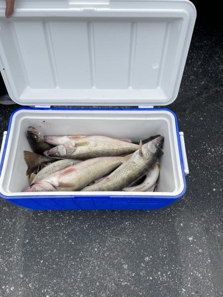 We got these 2 from Indiana their limits of walleye this morning and I reeled in mine too. It started rough and got rougher as we went. The wind picked up and is rippin out of the north east. Keeping balance was becoming an issue as we wrapped up the box of 18 walleye. We will see what tomorrow brings, isn’t looking a whole lot better😒 we have had a lot of east north east wind the past few weeks….Bandits 50-80 back jet 40’s back 40 with spoons and dipsy #1 setting back 22-27 with spoons at 1.8-2.4 with the wave surge today.