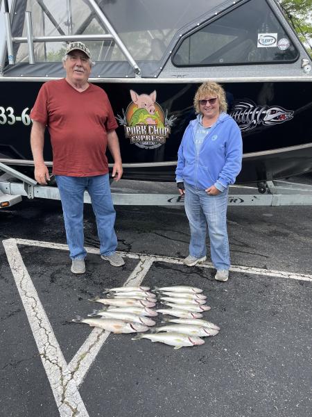 Second trip was a good one we boated this crew from Cincy their limits and I reeled in some more of mine too before the rain showed up. Spoons did the work today. Jet 40’s back 30-45 and dipsy on setting 1 22-27 and setting 3 32-37 did the work at 2.0 south passage.