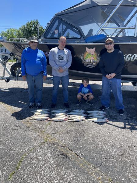 Great second trip with this Ohio crew. Little AJ caught his first walleye and got to steer the boat for his birthday!!!! We had a ball out there this afternoon. The weather doesn’t get any better although we could do without the north east wind. We caught at least 40 walleye on this trip the fish are absolutely on a food slaughter right now eating everything in sight. Back at it in the am…. Bandits and flicker 11’s 40-30’ of water off beaver 2.5-3.0 mph