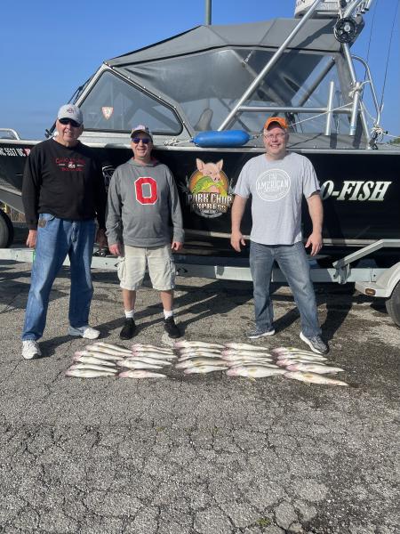 Our morning trip was a catching trip all the way over 50 came in the boat. We kept their 18 and Caleb and I reeled in our limits too it was all hands on deck 4 and 5 at a time. Great fishing for the southern Ohio crew. It’s great to have Caleb back on board as first mate. We ran flickers and bandits 60-30 back 20-30’ of water and dipsy 1-37, 3-47 with stingers. 2.8 mph off vermillion