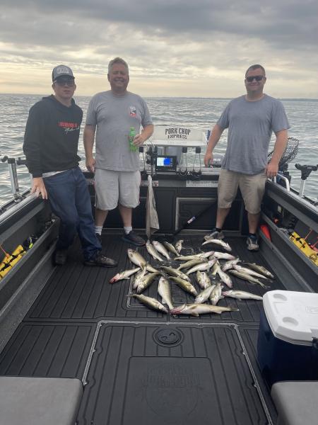 Absolute beat down on the walleye this morning. We boated 50+ and kept Tony and crew their 18 and Caleb and I reeled in our 12 too. Absolute amazing fishing. Bandits 120-60 back speed 3.0 dipsy 1-40, 3-50 40’ of water off Lorain.