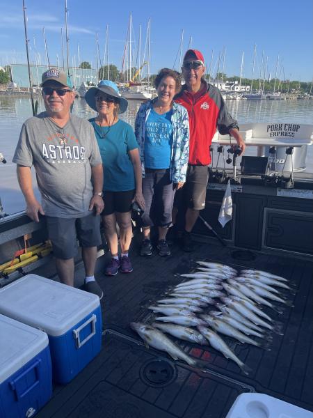 Beautiful morning on the lake with this crew from Ohio and Texas. We boated them their limits and I reeled a few cleaning up got done before the winds start ramping up today. 40’ of water out of Huron bandits and flicker minnows #11 2.5-2.8 mph 100-70 back couldn’t keep all the rods in the water. Great fishing.