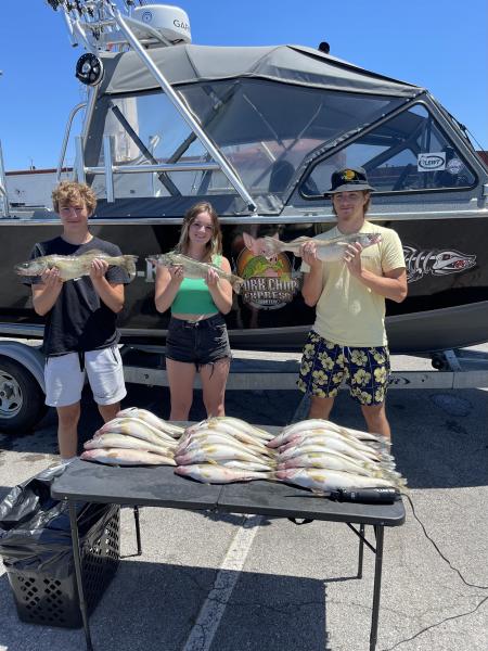 Second trip was Gorgeous on the lake wind died down and we boated this crew from VA their 36 walleye. Some nice fish too. Fun afternoon on the water. Back at it tomorrow morning. Bandits back 150-130 2oz and dipsy 0-70, 1.5-90, 3.5-120 stinger spoons. Speed 3.0