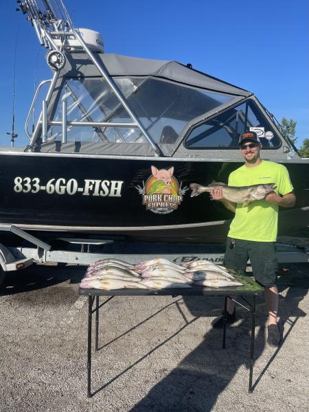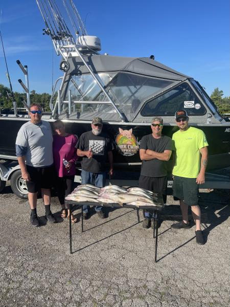Morning trip Was a quick one today they where chomping. We got this Indiana crew their limits of nice walleye including a 29” Hawg personal best that is getting mounted. I reeled in my limit too. Great morning less the bugs. Get your summer trip booked call captain Sam 419-635-8003. We ran bandits back 150-120 2oz and dipsy 0-70, 1.5-90, 3.5-130 stinger spoons 3.0 mph 40-50’ of water off Lorain