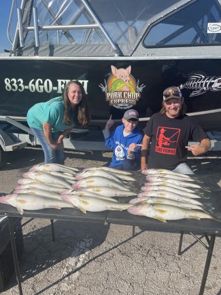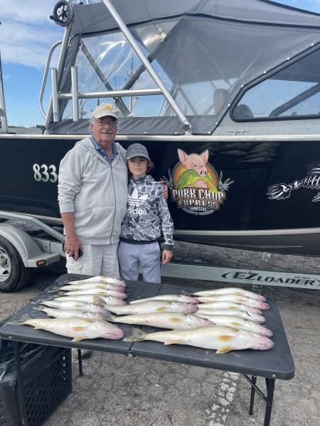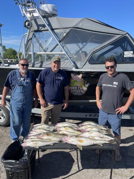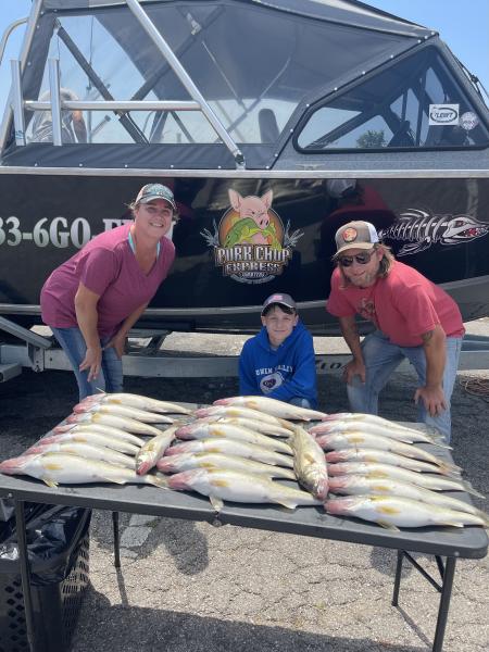 June 29 Good morning trip for grandpa John and Jagger. It was his first trip On Erie we boated them their limits and some of mine out in the waves today. Some nice sized fish. Thanks for the fish-picks John. He invented the fish pick great way to hold a walleye. Dipsy is still on fire in 50Â’ of water.