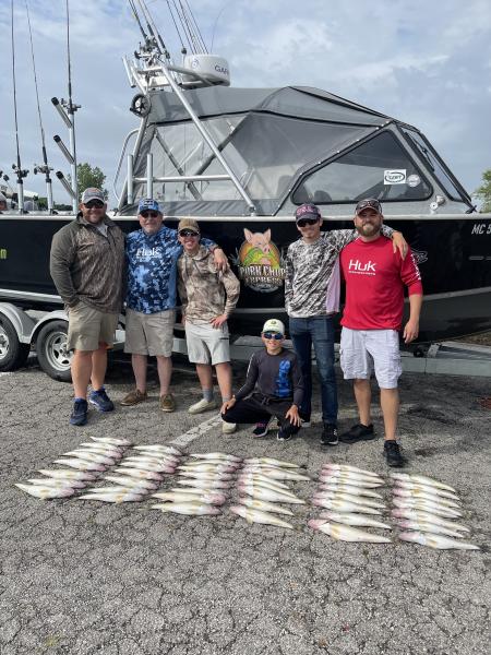 July 6 Fantastic trip this morning with this great crew from Indiana. We boated them all of their fish and Caleb and I reelednin ours to for another 8 man limit of great eating walleye. I have several dates still available in July. Call captain Sam to book a trip out of lorain. 419-635-8003 50’ dipsy and weighted bandits 3.0mph