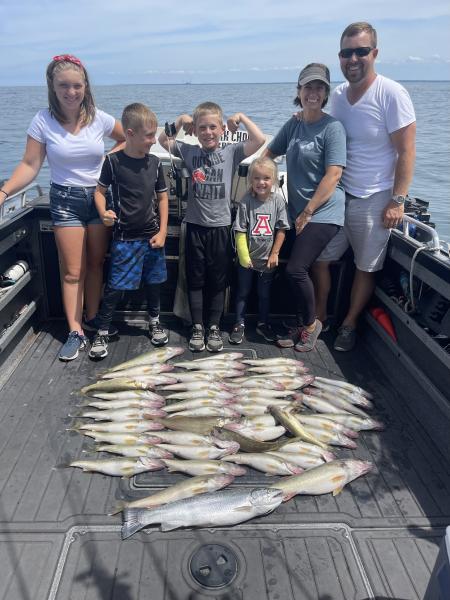 July 7 Great trip today with this crew from Columbus. These kids are fishing machines. They reeled and netted fish on their own. we boated them their limits of walleye and caleb and I reeled in ours too. 8 more limits headed to the grill and a bonus steel head. Great day on the lake 50’ dipsy and weighted bandits 3.0 mph
