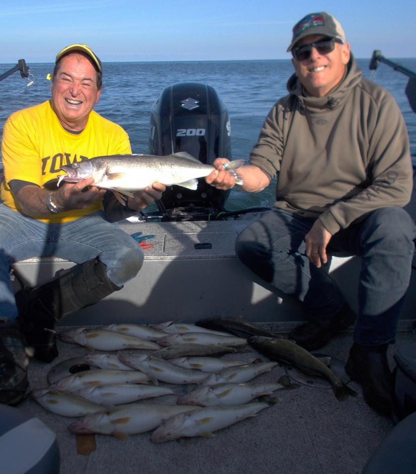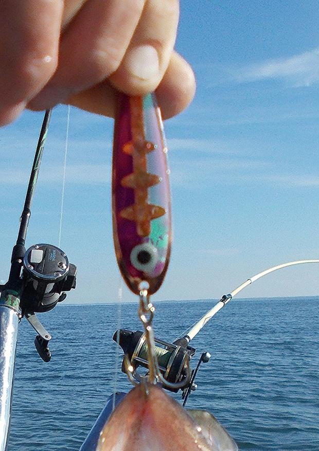 The divers produced most of the fish and small (like 2 1/2" ers from Seaquest Lures) were best. Purple tape on both silver and copper blanks scored as well as Purple/UV. A few fish came on Bandits, Deep Hit Sticks and a new Rapala deep diver called Gold Digger. Chrome/Blue all of them trolled 150 back since we weren't turning. Extracted three limits, one gaspergoo and a white perch. Tossed a couple of dinks, but the rest were 19 to 25 inches.