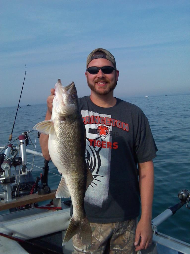 The guys at the lauch comming in were all saying it was slow, 1 or 2 fish per boat, all morning. So I was planning on a slow afternoon. But it didnt take 10 minutes of lines in the water and we landed our first lake erie walleye. We laughed, high fived, and took a picture. No kidding. (My dad had never been on lake erie before).