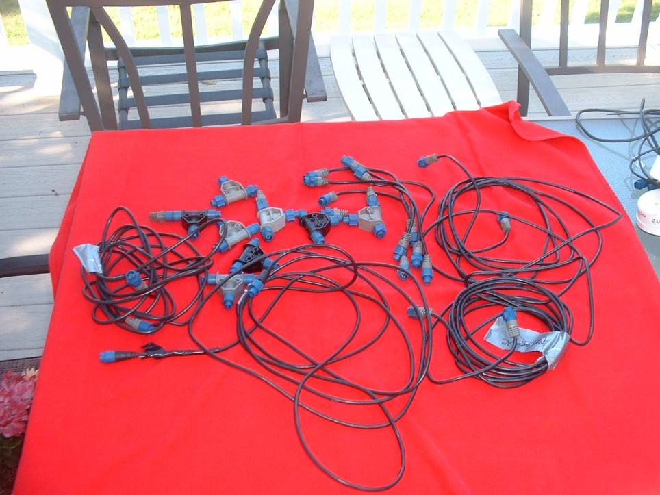 Also pictured and included are 4 approximately 15" network cables all with blue connectors with a male and female plug on each. There are 8 cable splicers used to network a GPS system. All are three prong and they have 2 male and one female plug. There are 4 connector plugs. There are 5 approximately 12" blue connector cables with a female and male plug. These should all by working.